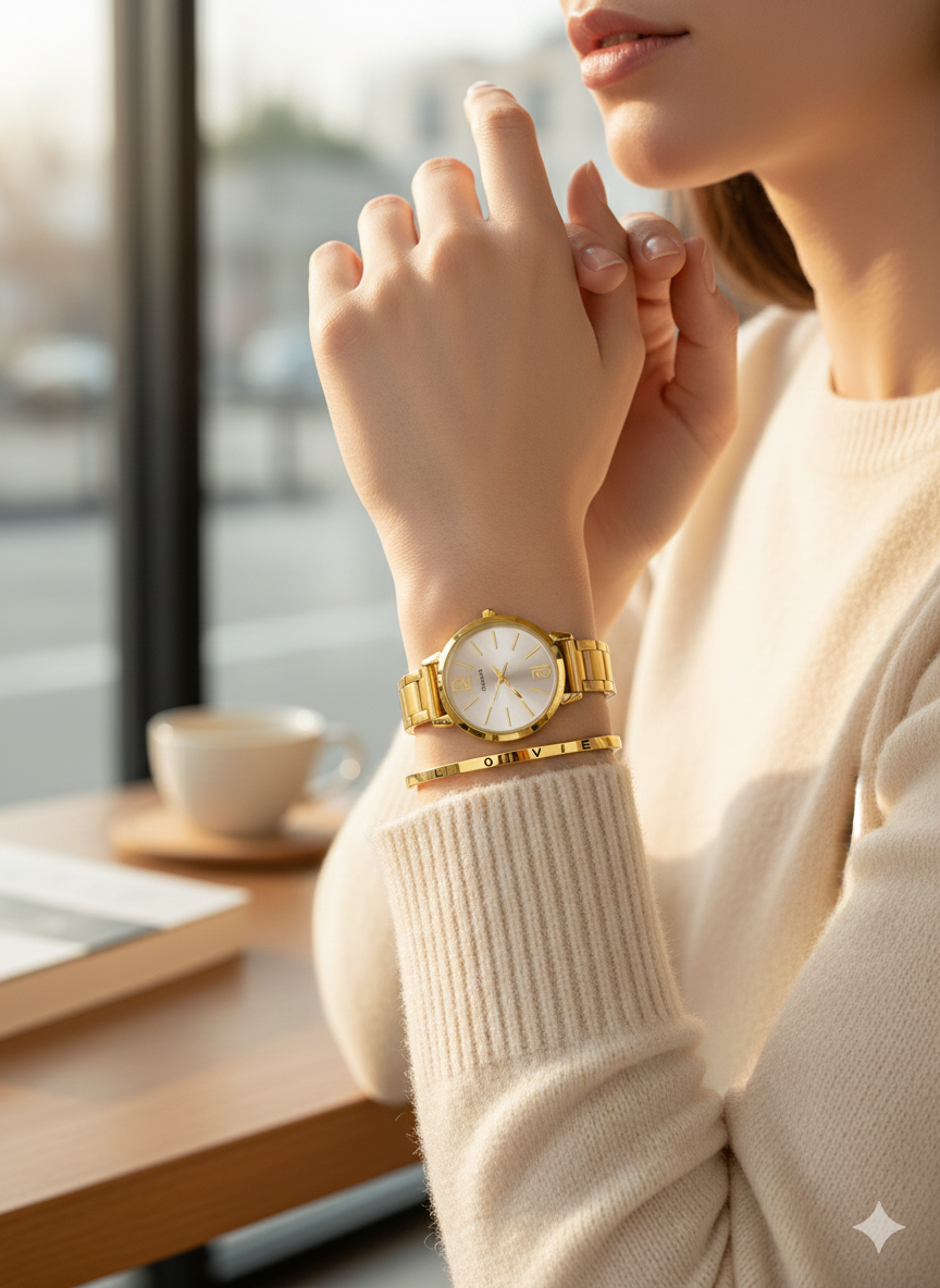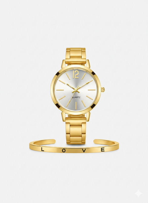 O Conjunto Pure Gold é a expressão máxima da elegância atemporal. Unindo um relógio de linhas minimalistas a um bracelete rígido com a gravação "LOVE", este duo foi desenhado para a mulher que aprecia o luxo nos detalhes discretos.
